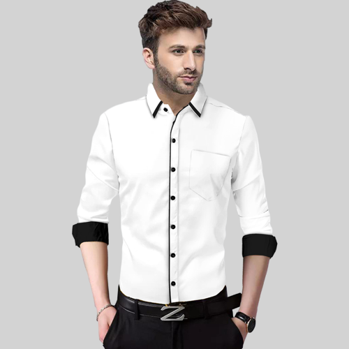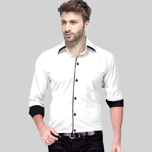 Men's Liner Design Slim Fit White Black Cotton Shirt