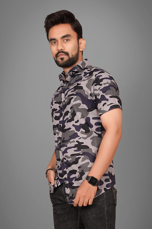 SUR-T Men's Regular Fit Army Design Spread Collar Casual Grey Shirt