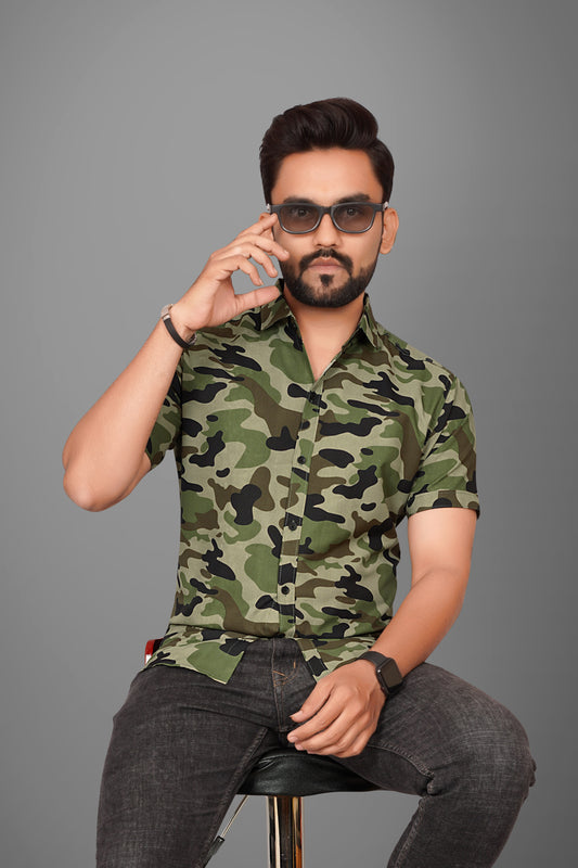 SUR-T Men's Regular Fit Army Design Spread Collar Casual Green Shirt