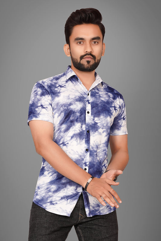 SUR-T Men's Regular Fit Printed Spread Collar Casual Blue Shirt