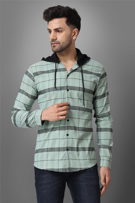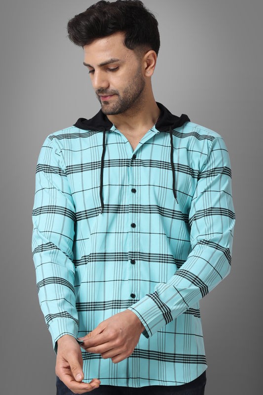 SUR-T Men's Regular Fit Checkered Hood Collar Casual Sea Green Classic Hoodie Shirt