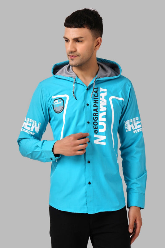 SUR-T Men's Regular Fit Printed Ribbed Collar Casual Sea Blue Classic Hoodie Shirt
