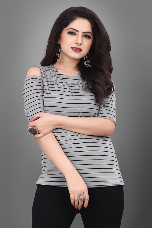SUR-T Casual Half Sleeves Striped Women Silver Top