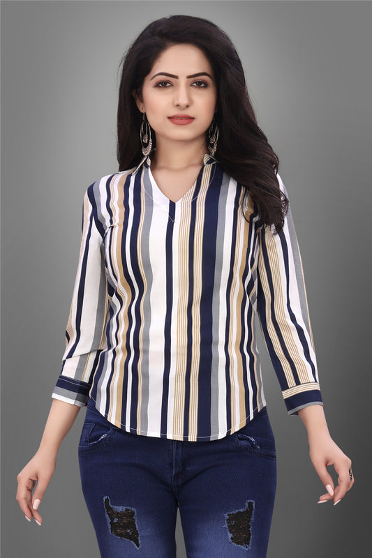 SUR-T Casual Regular Sleeves V-Shape Striped Women Beige Top