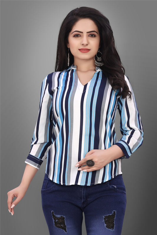 SUR-T Casual Regular Sleeves V-Shape Striped Women Blue Top