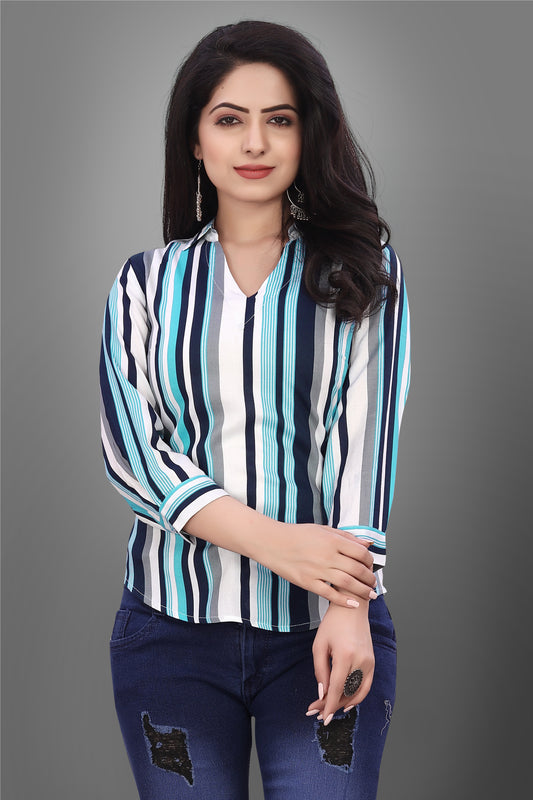 SUR-T Casual Regular Sleeves V-Shape Striped Women Firozi Top