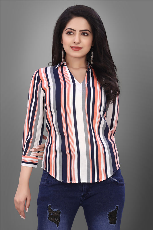 SUR-T Casual Regular Sleeves V-Shape Striped Women Peach Top