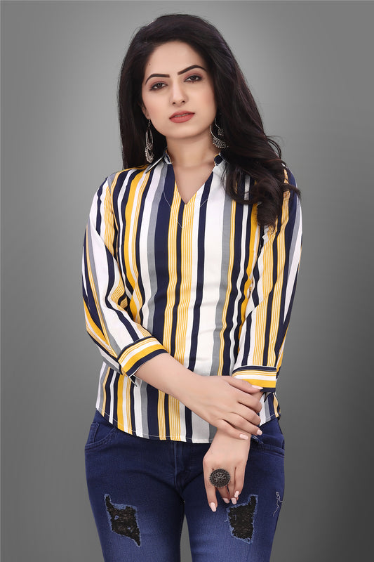 SUR-T Casual Regular Sleeves V-Shape Striped Women Yellow Top
